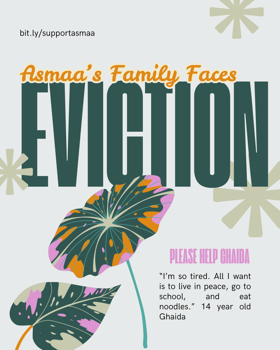 Image description: Large colorful tropical leaves and big asterisks in front of text. Text says "bit.ly/supportasmaa | Asmaa's family faces eviction | please help Ghaida | 'I'm so tired. All I want is to live in peace, go to school, and eat noodles.’ 14 year old Ghaida”